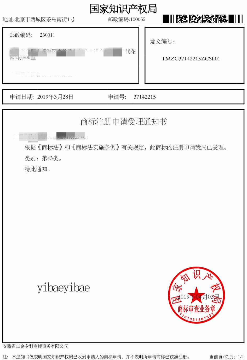 第43类“YIBAEYIBAE”受理通知书