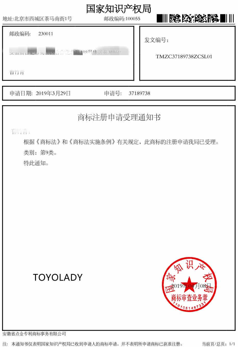 第9类“TOYOLADY”受理通知书