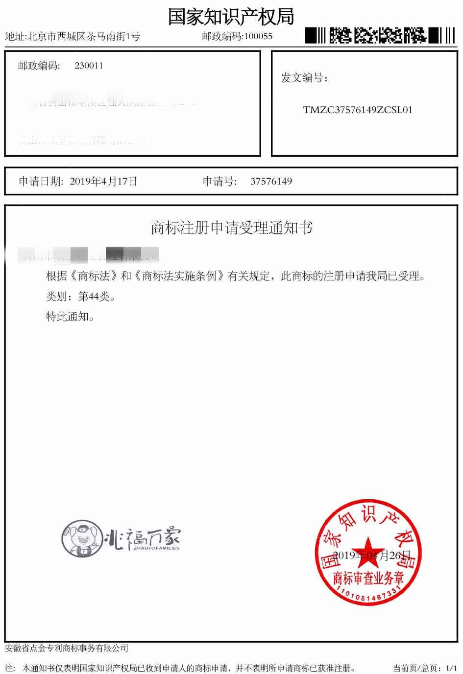 第44类“兆福万家”受理通知书