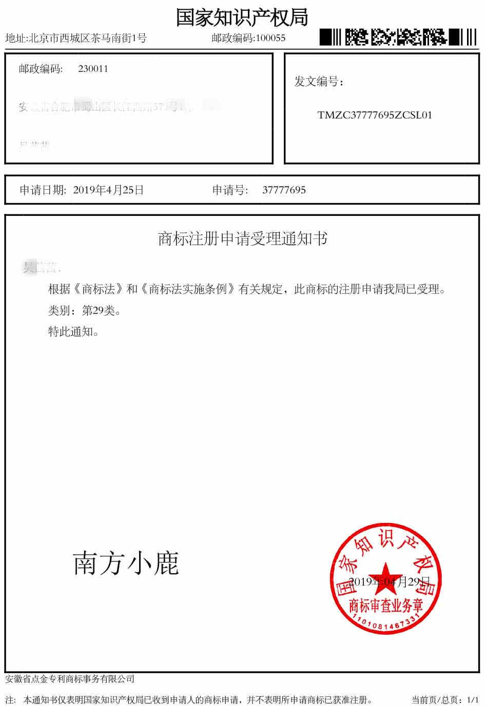 第29类“南方小鹿”受理通知书