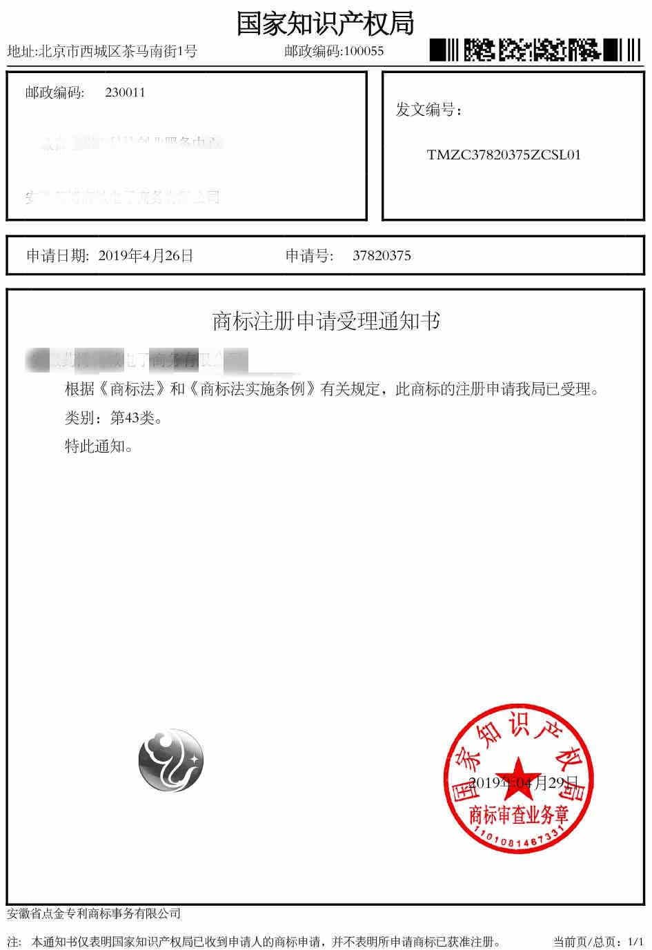 第43类“图形”受理通知书