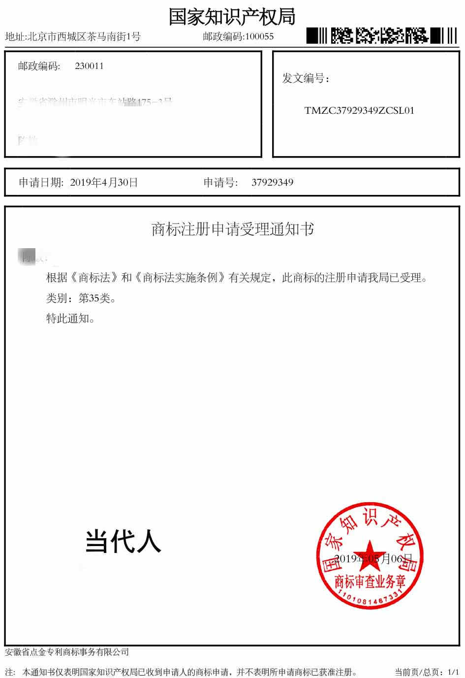 第35类“当代人”受理通知书