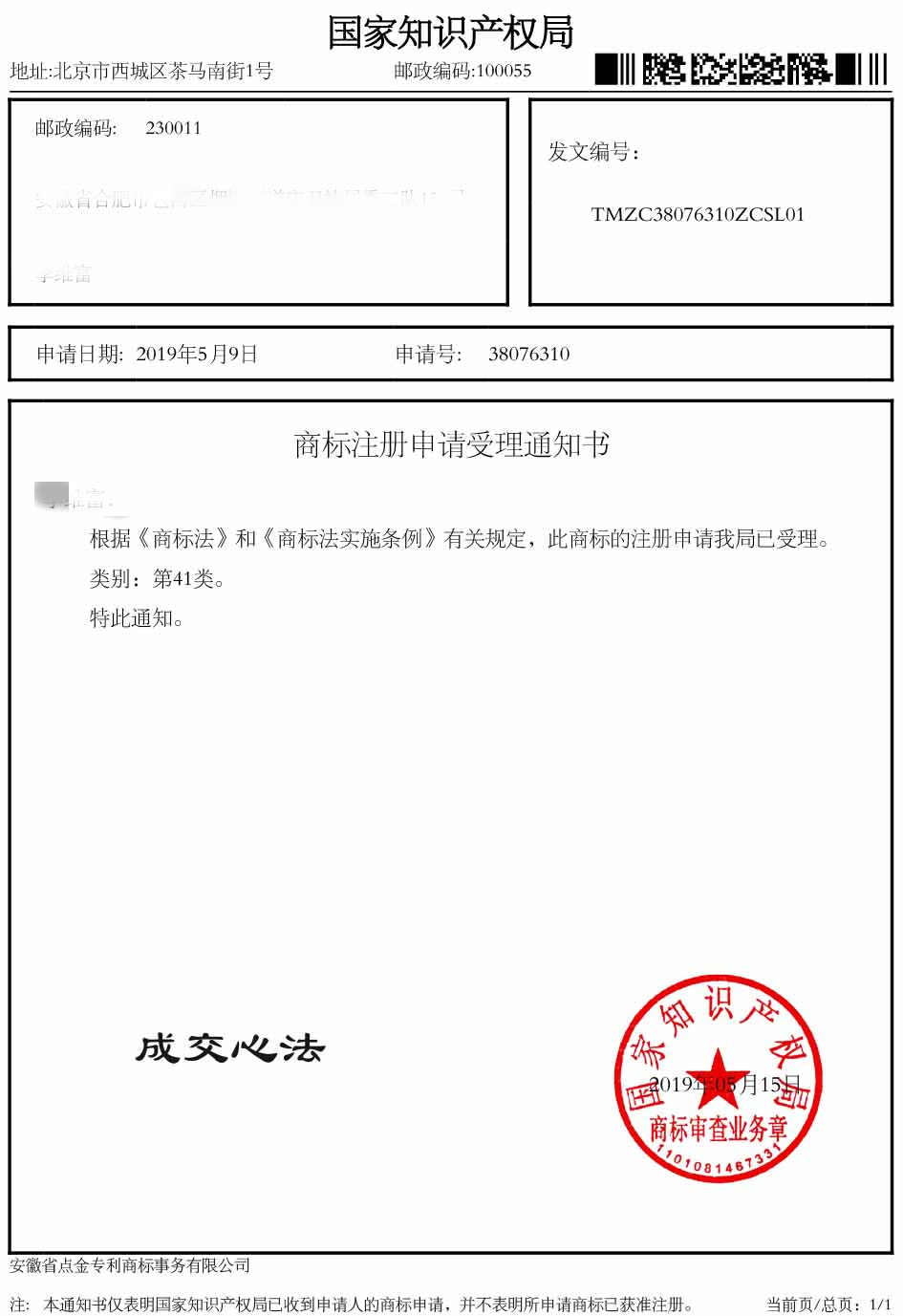 第41类“成交心法”受理通知书