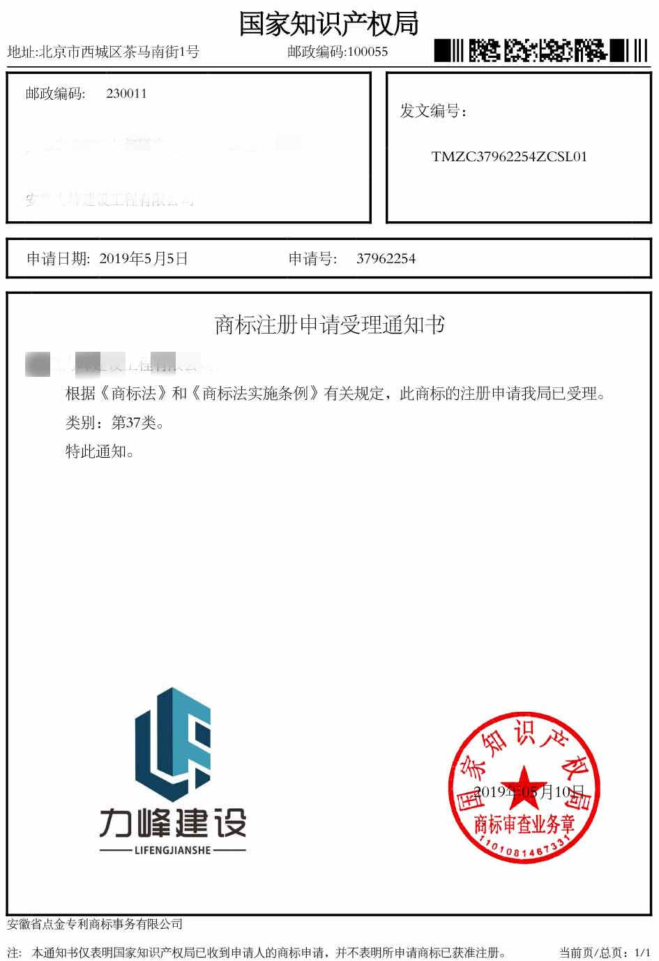 第37类“力峰建设”受理通知书