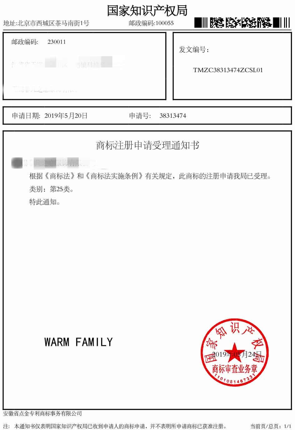 第25类“WARM FAMILY”受理通知书