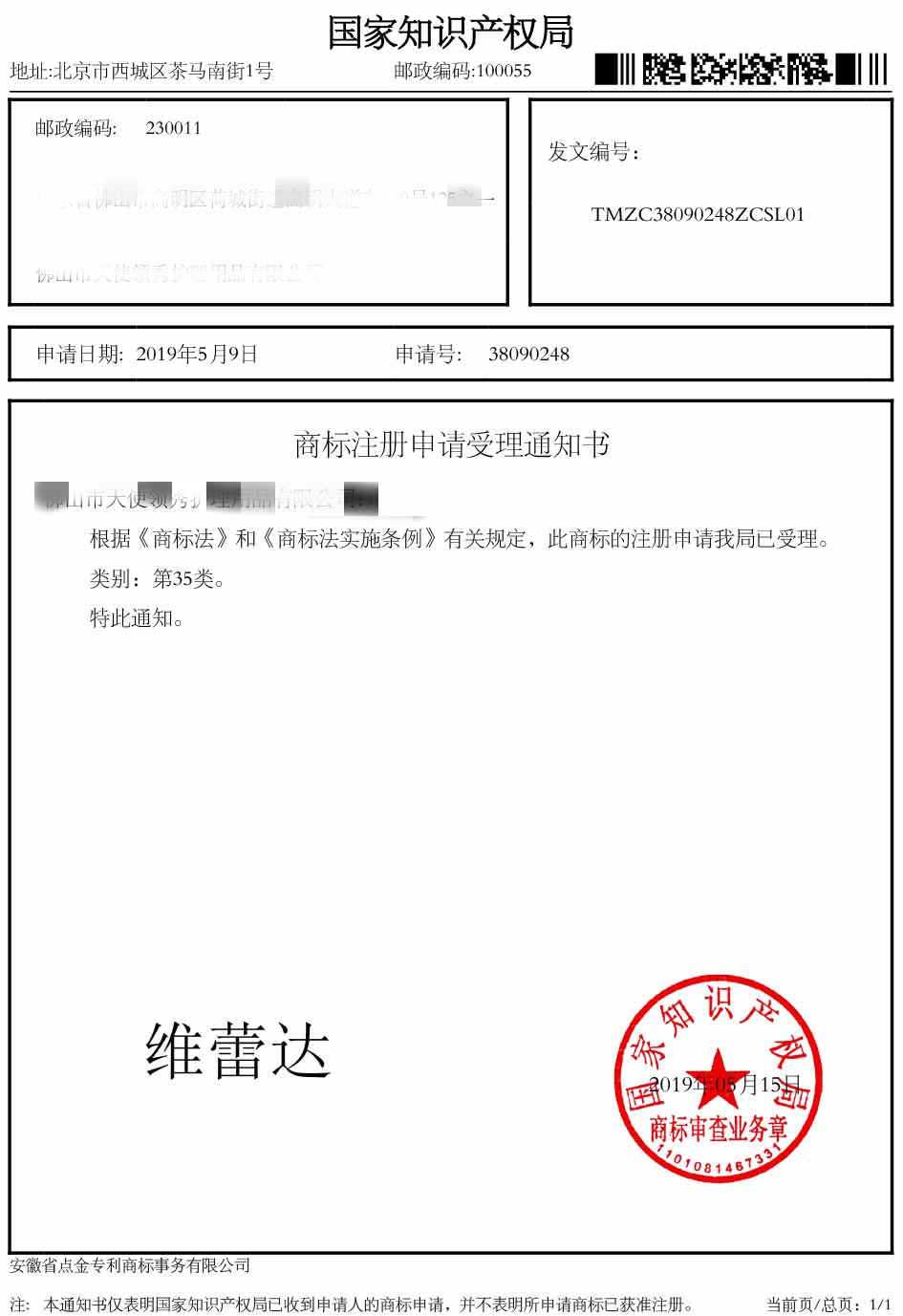 第35类“维蕾达”受理通知书