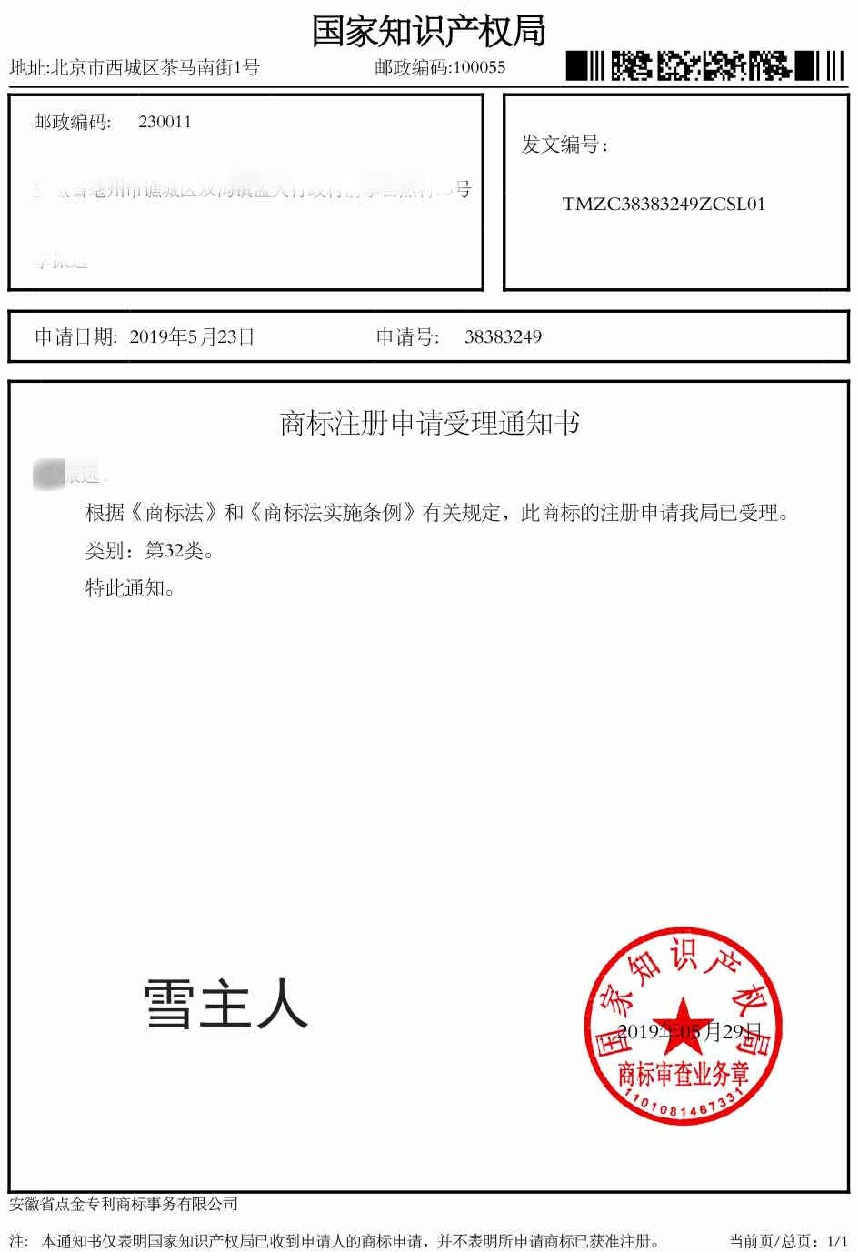 第32类“雪主人”受理通知书