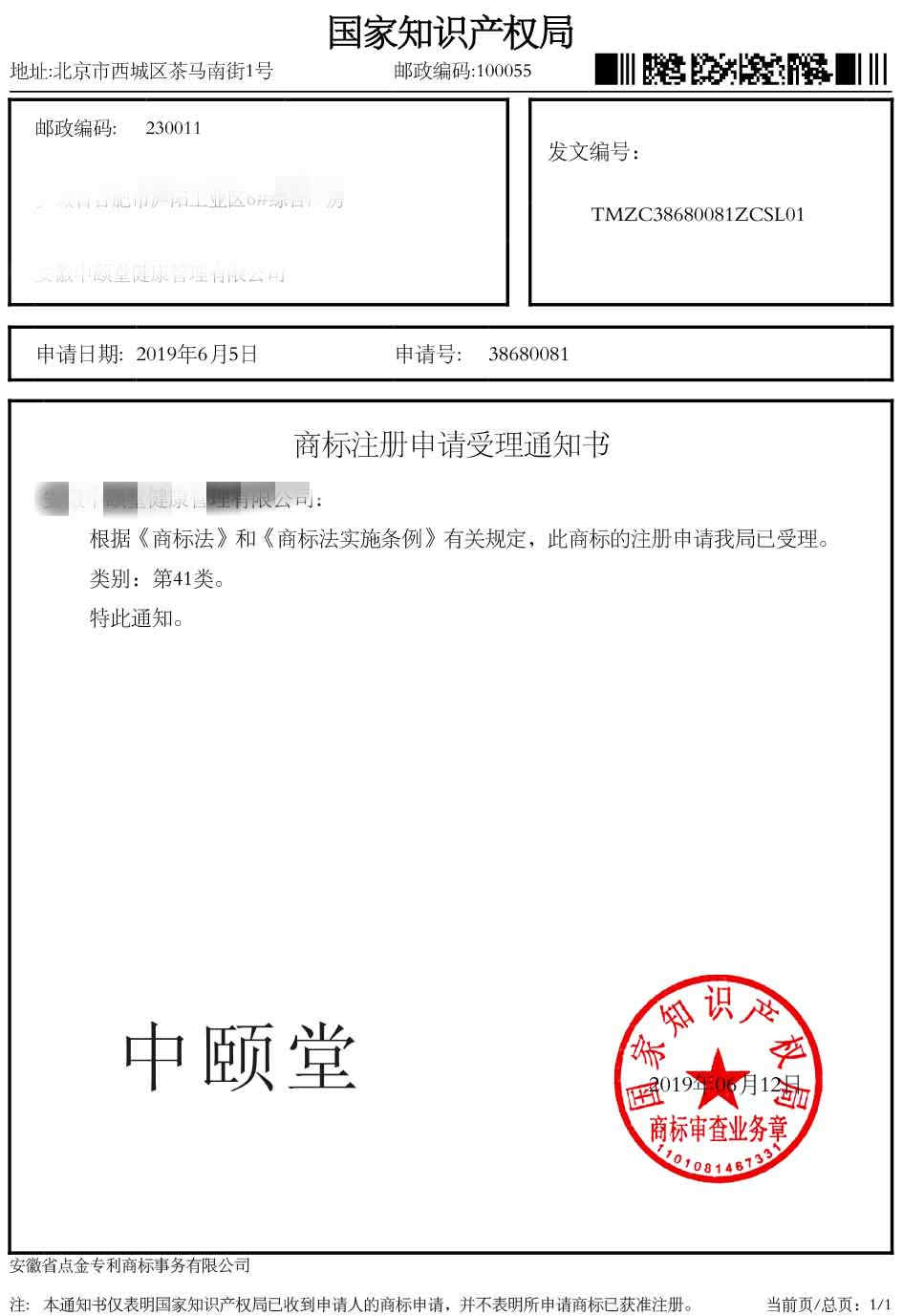 第41类“中颐堂”受理通知书