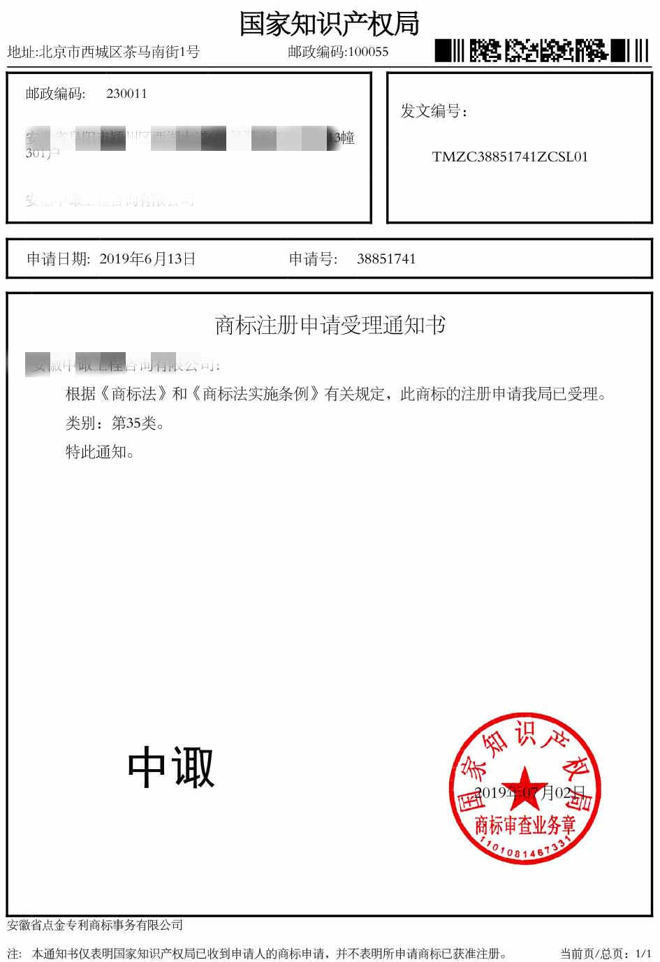 第35类“中诹”受理通知书
