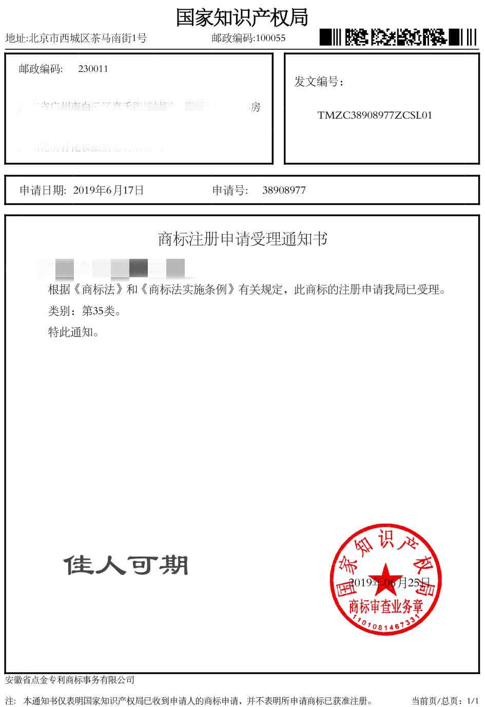 第35类“佳人可期”受理通知书