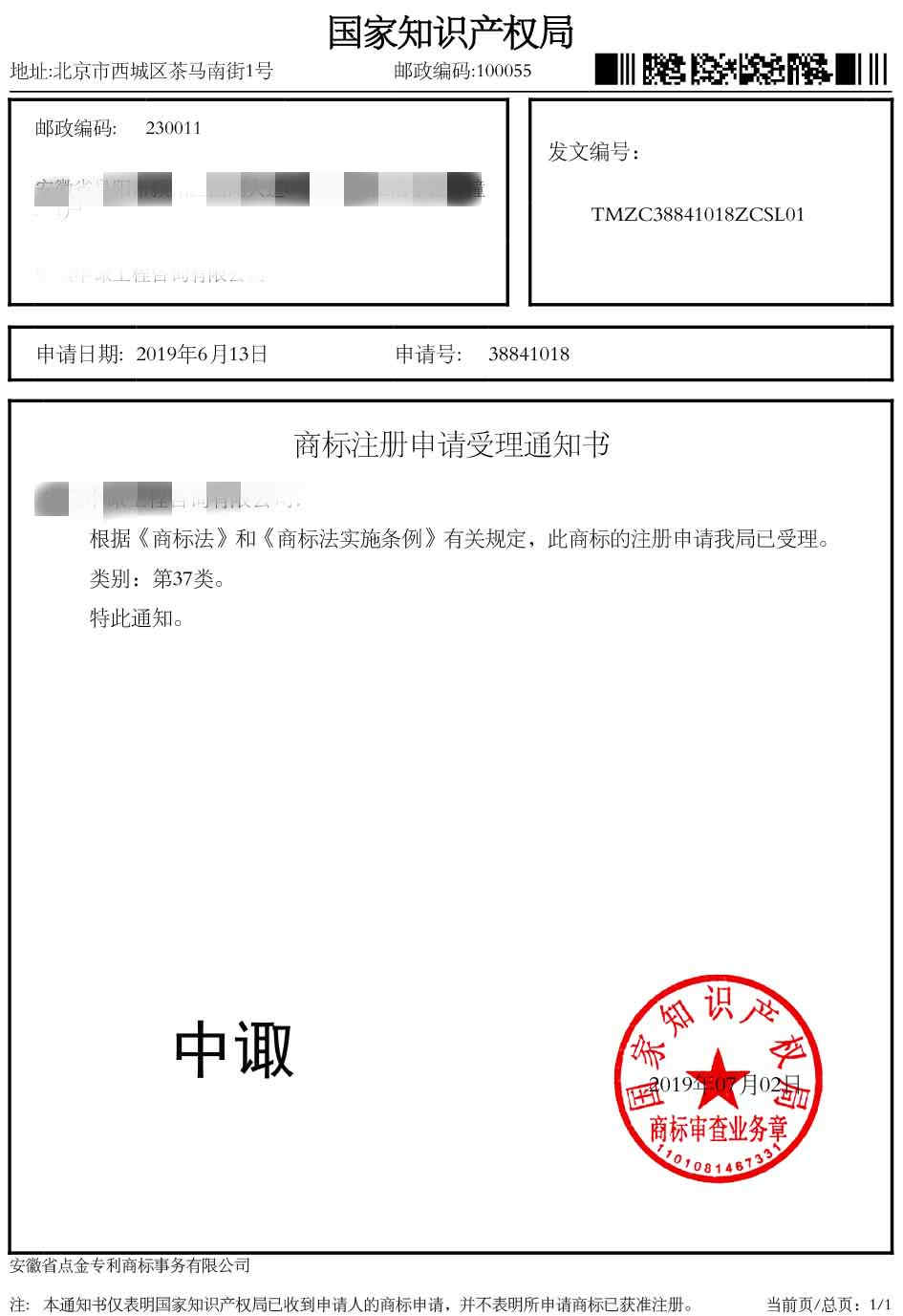 第37类“中诹”受理通知书
