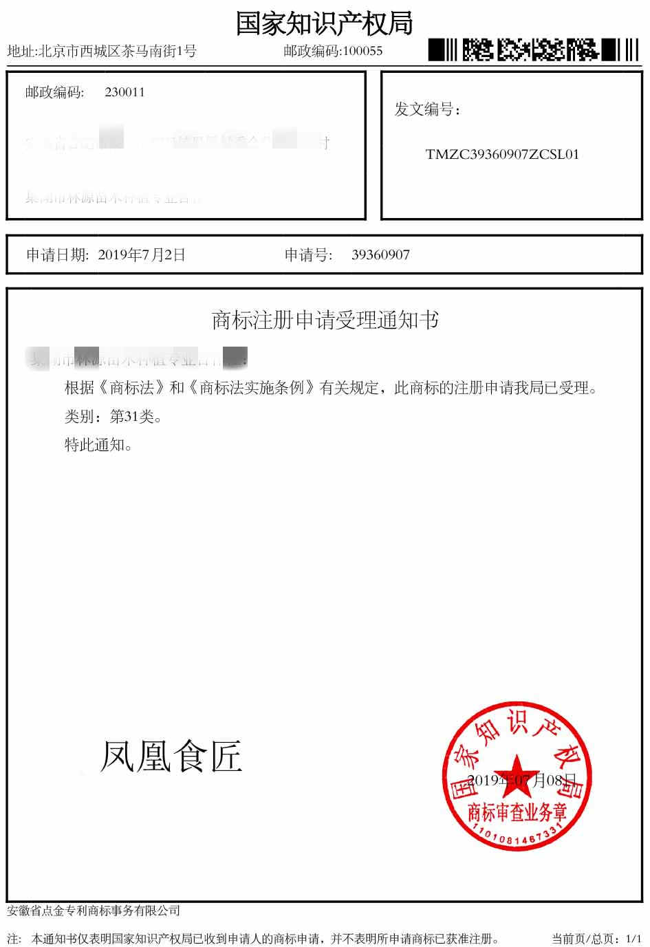第31类“凤凰食匠”受理通知书