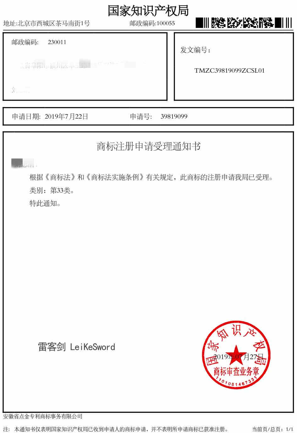 第31类“雷客剑”受理通知书
