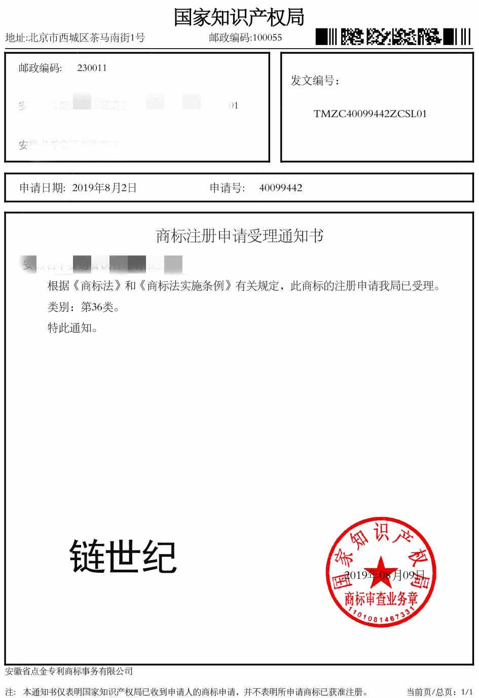 第236“链世纪”受理通知书