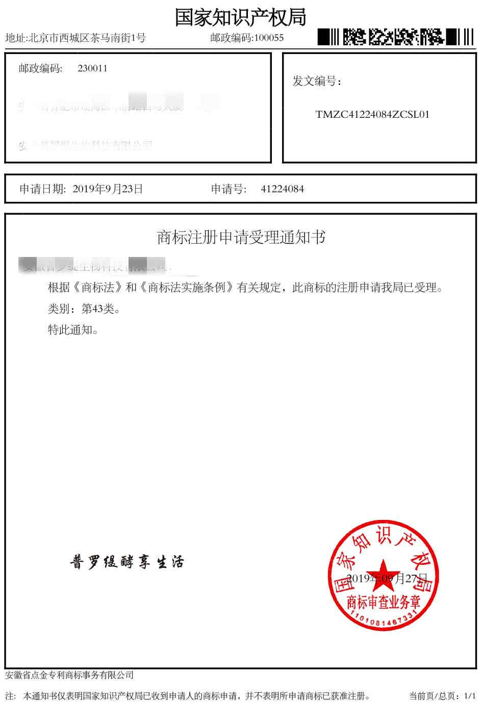 第43类“普罗缇酵享生活”受理通知书