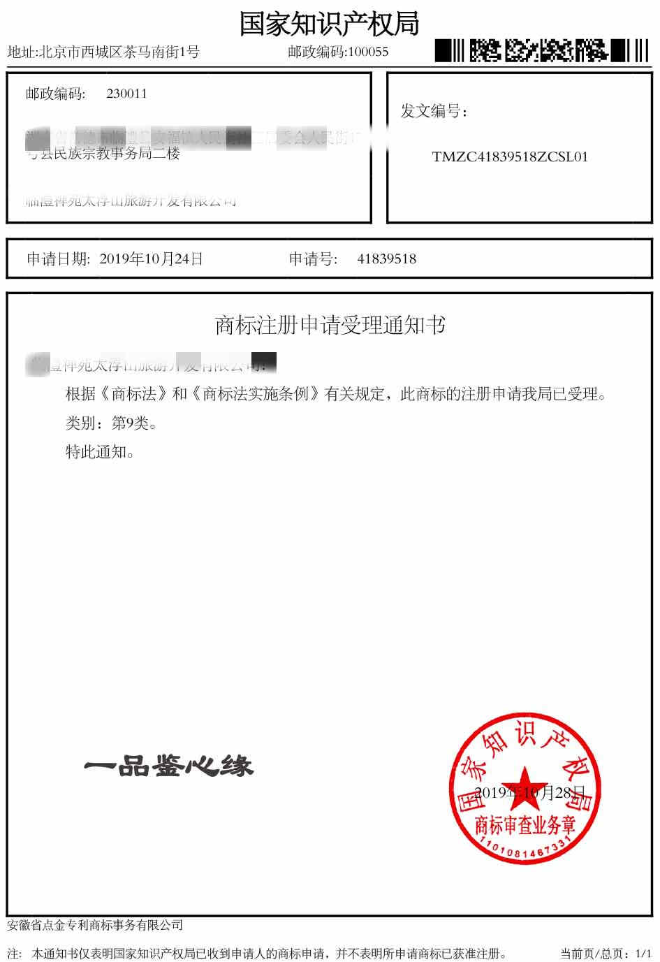 第9类“一品鉴心缘”商标受理通知书