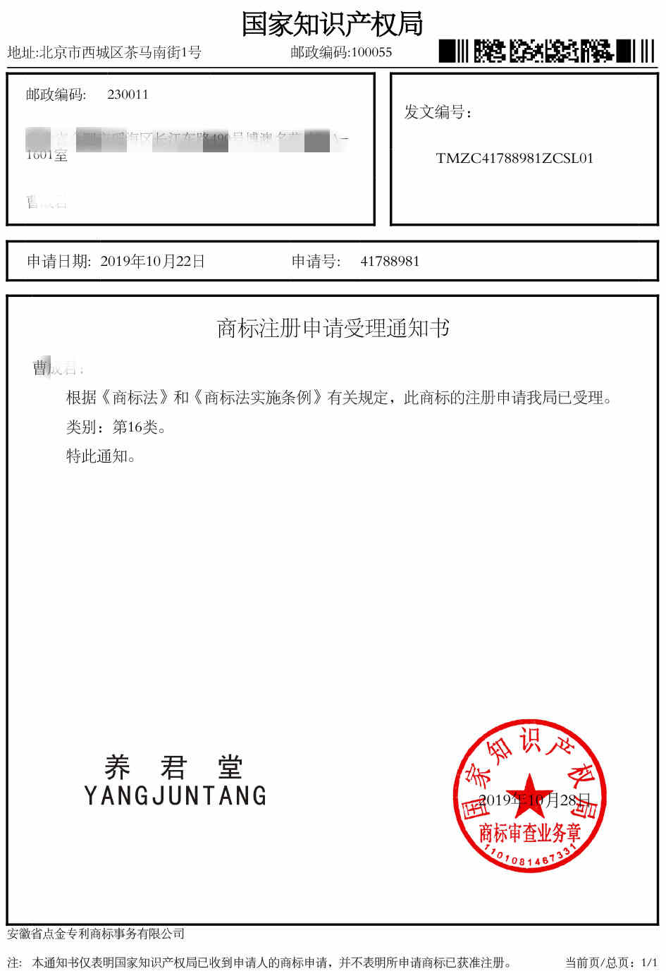 第16类“养君堂”商标受理通知书
