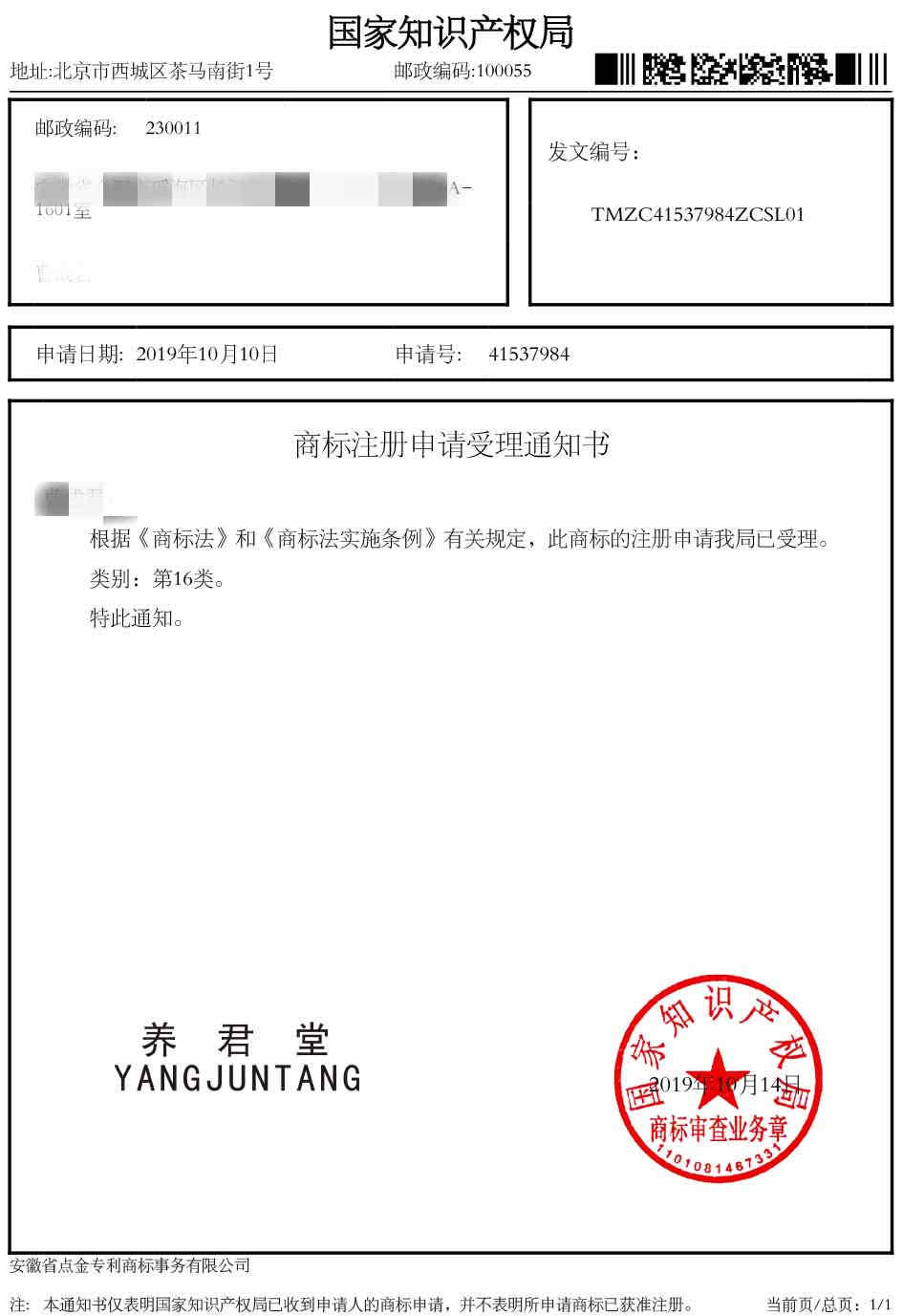 第16类“养君堂”商标受理通知书