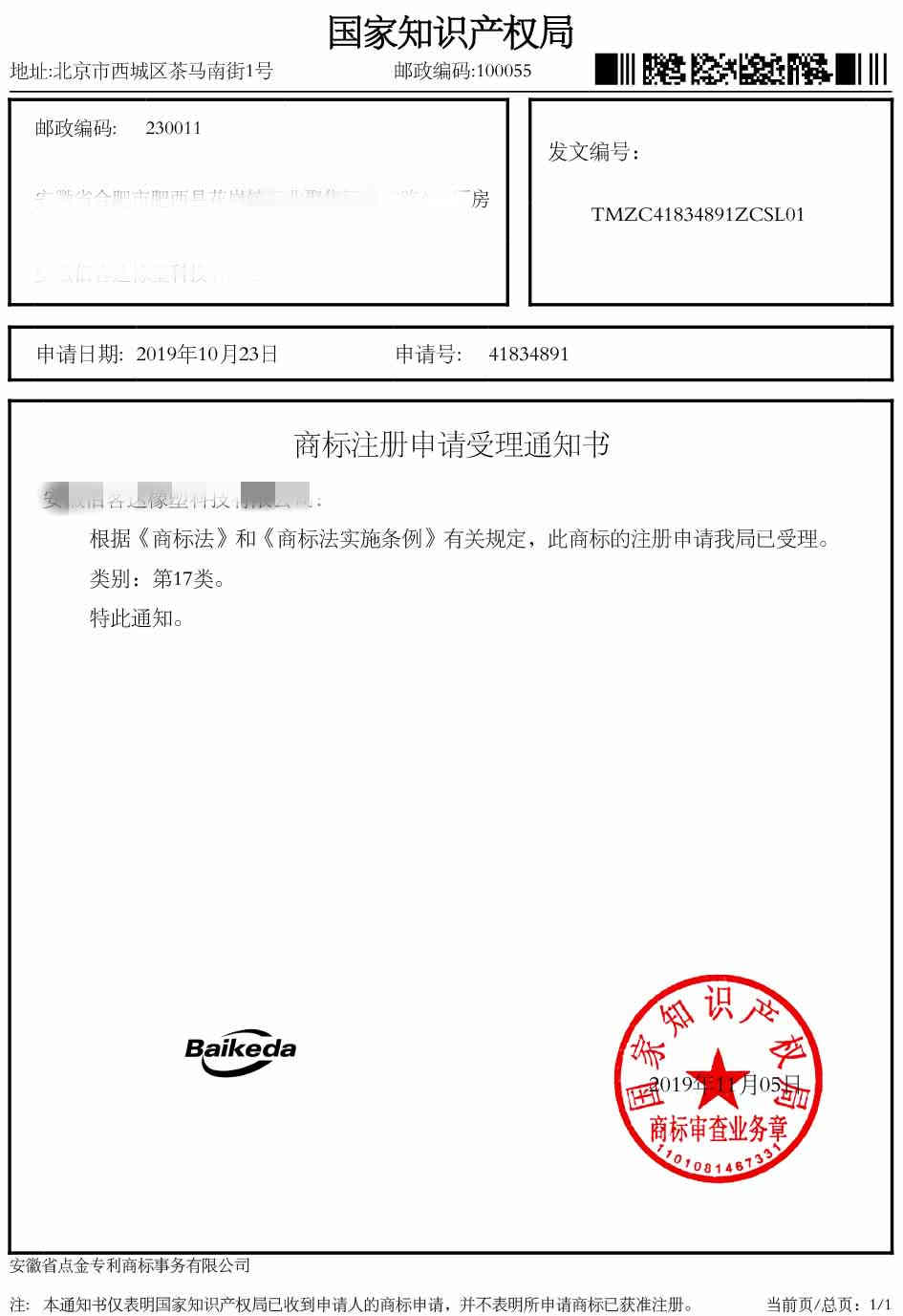 第17类“Baikeda”商标受理通知书