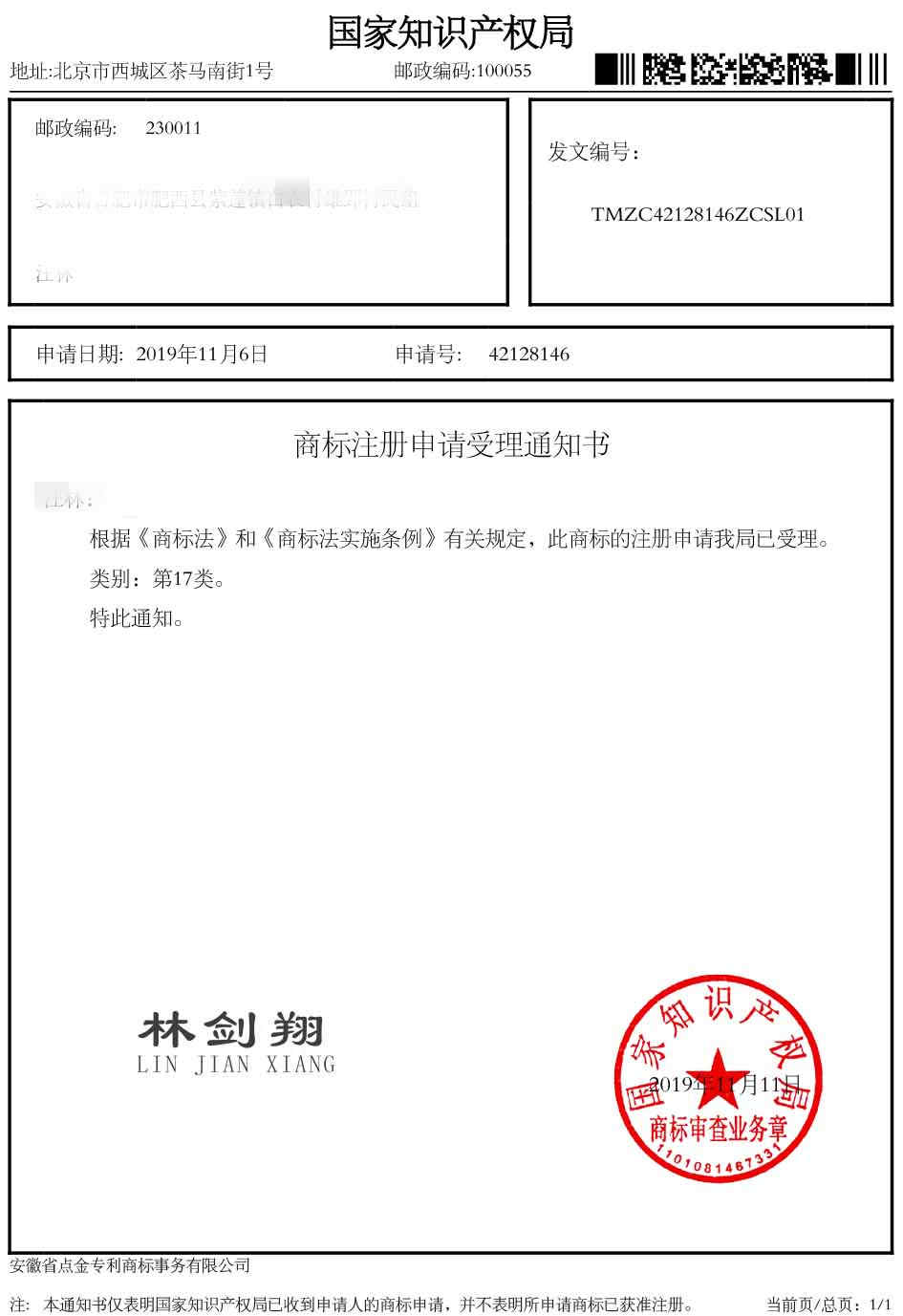 第17类“林剑翔”商标受理通知书