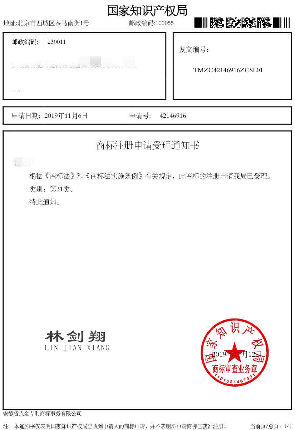 第31类“林剑翔”商标受理通知书