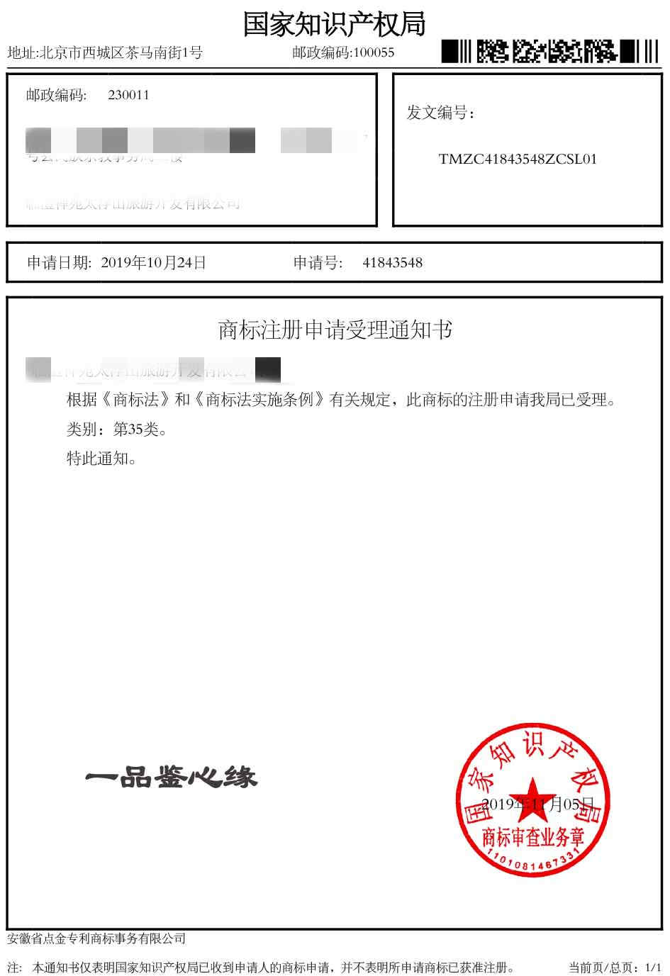 第35类“一品鉴心缘”商标受理通知书