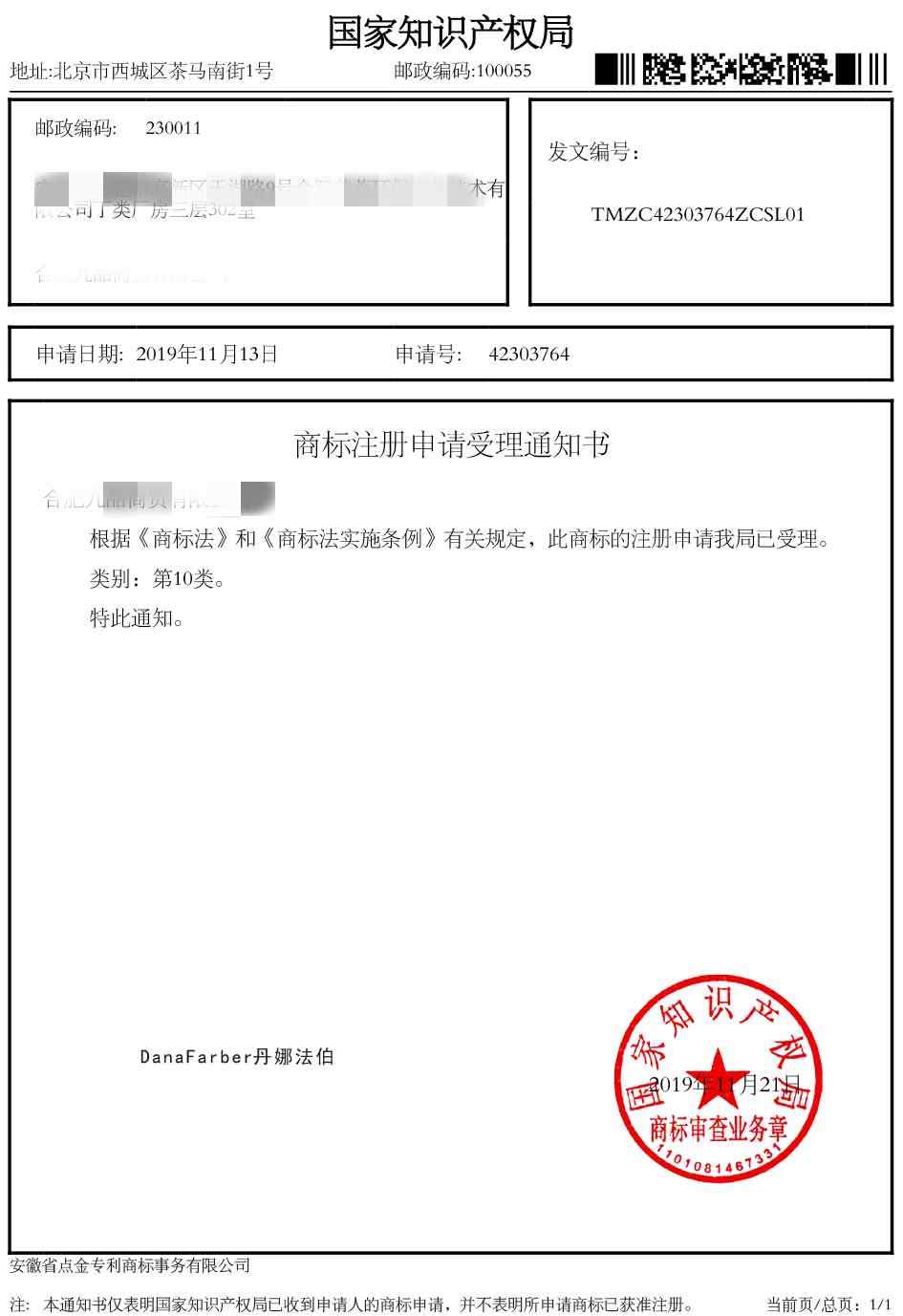 第10类“丹娜法伯”商标受理通知书