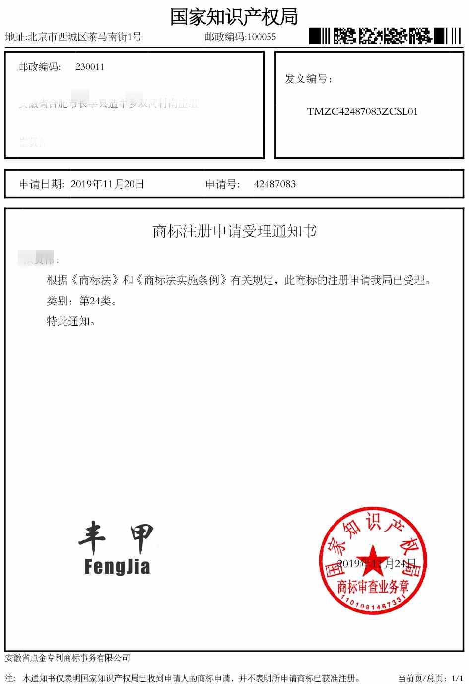 第24类“丰甲”商标受理通知书