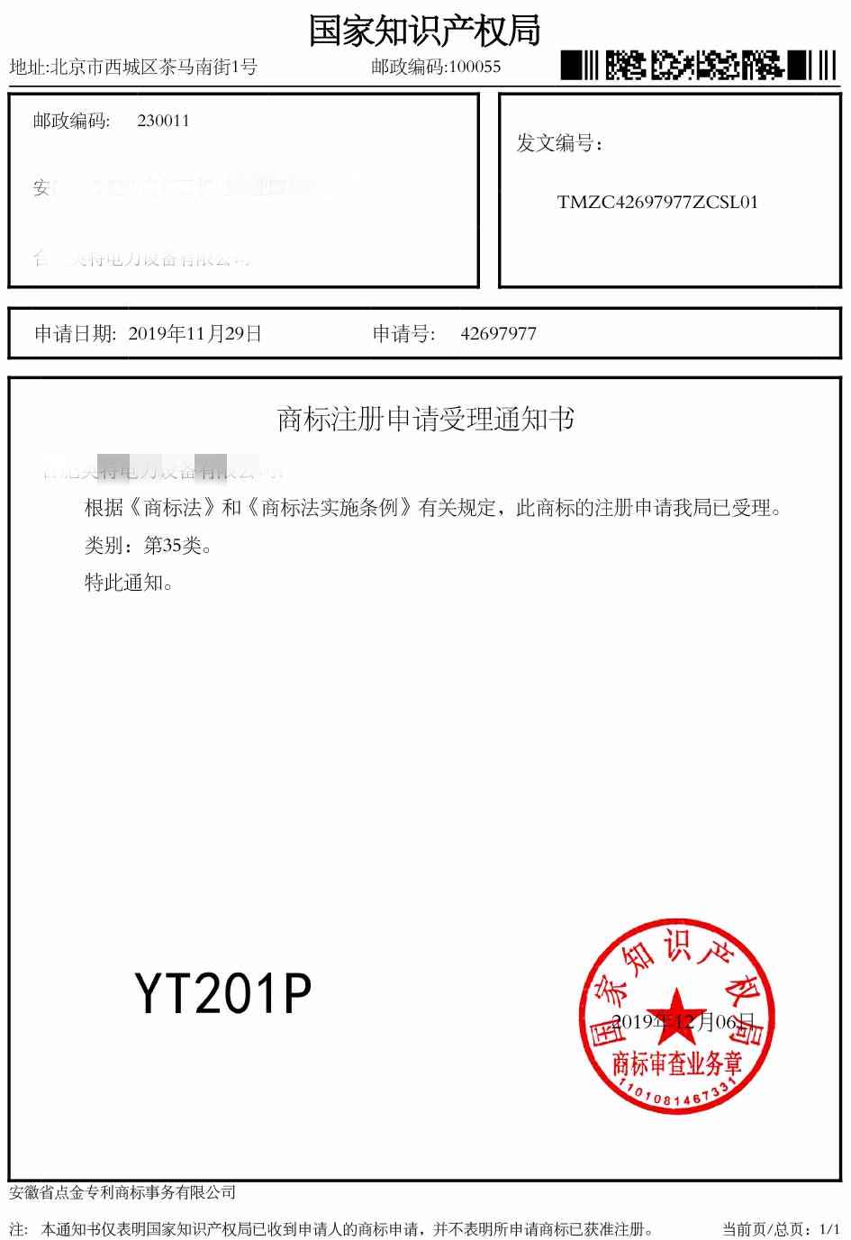 第35类“YT201P”商标受理通知书