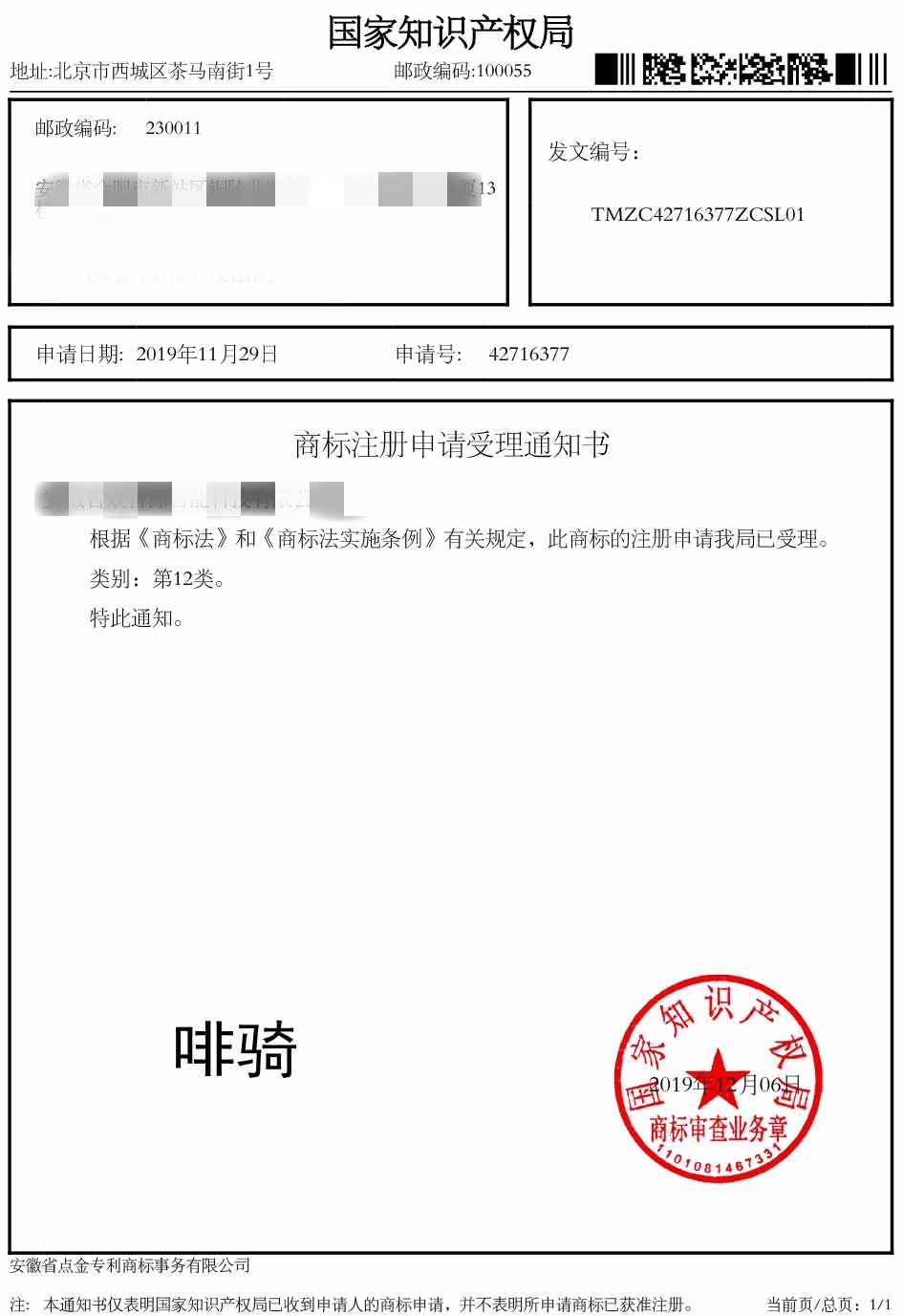 第12类“啡骑”商标受理通知书