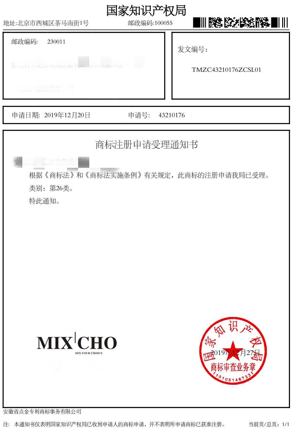 第26类“MIX CHO MIX YOUR CHOICE”商标受理通知书