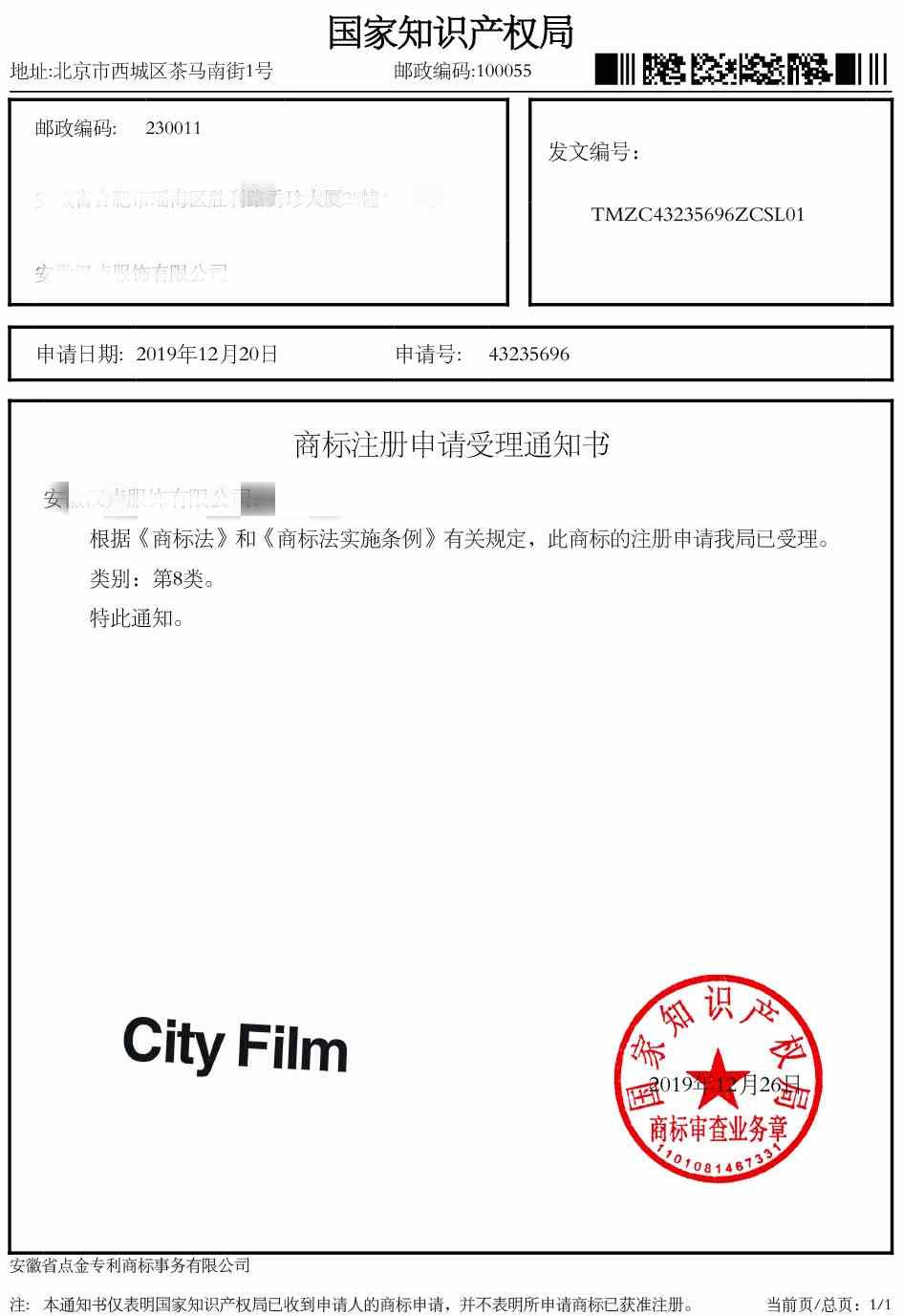 第8类“CITY FILM”商标受理通知书