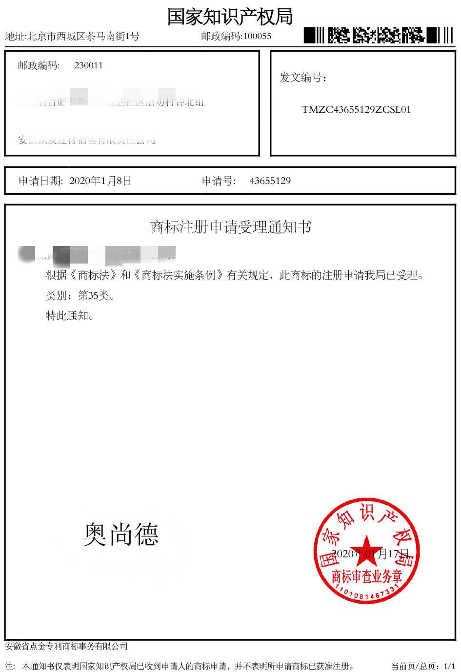 第35类“奥尚德”商标受理通知书