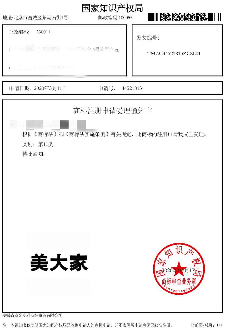 第11类“美大家”商标受理通知书