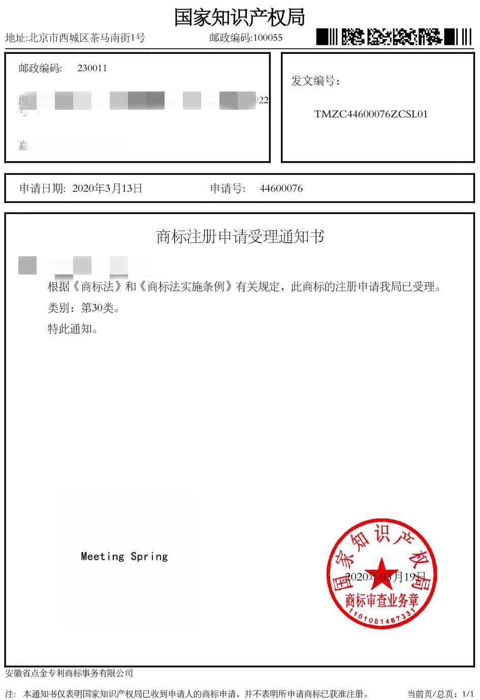 第30类“MEETING SPRING”商标受理通知书