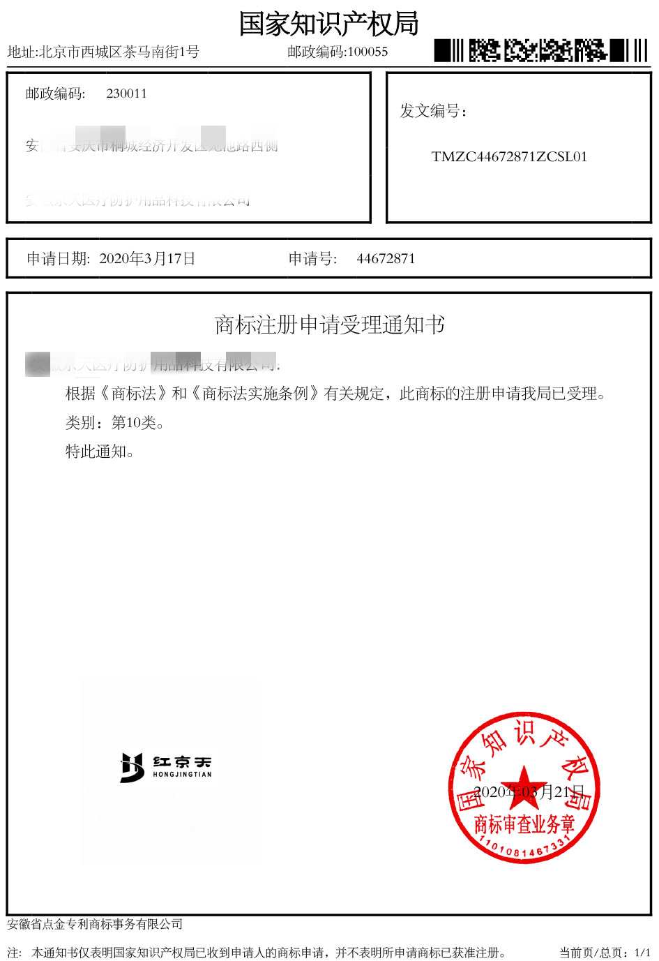 第10类“红京天”商标受理通知书