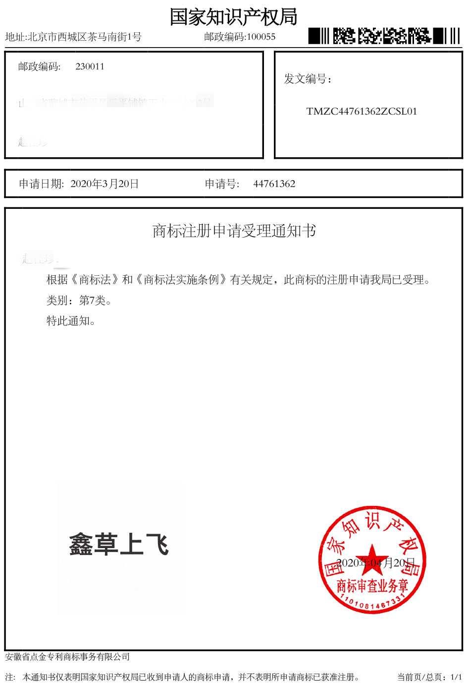 第7类“鑫草上飞”商标受理通知书