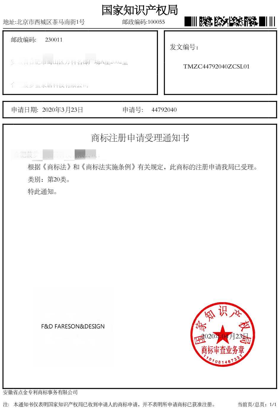 第20类“F&D FARESON&DESIGN”商标受理通知书