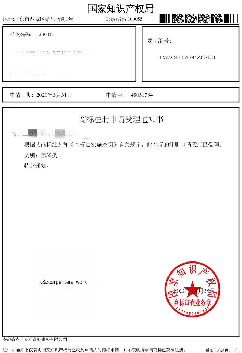 第35类“K&ZCARPENTERS WORK”商标受理通知书