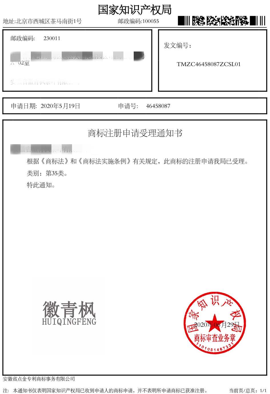 第35类“徽青枫”商标受理通知书