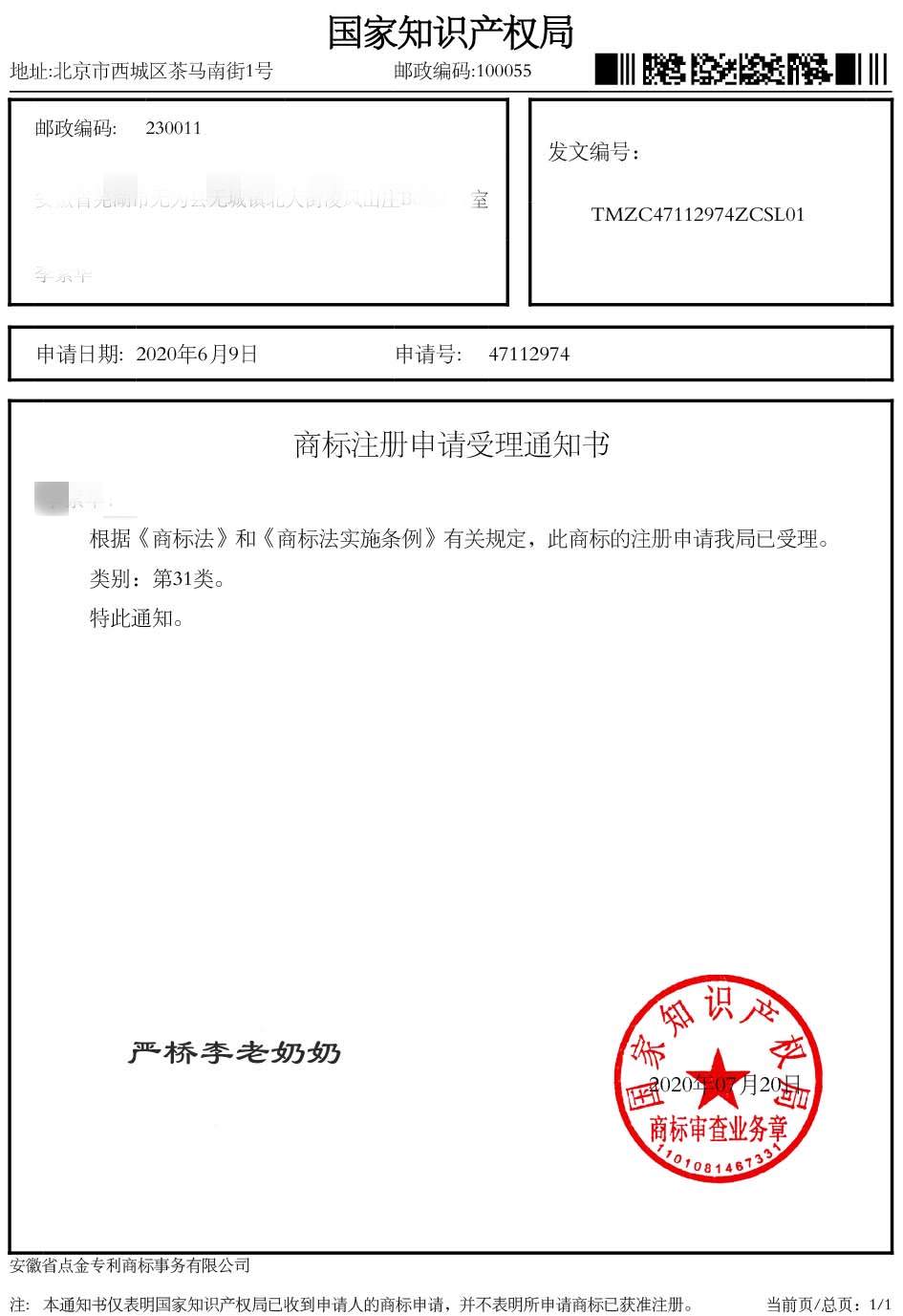 第31类“严桥李老奶奶”商标受理通知书