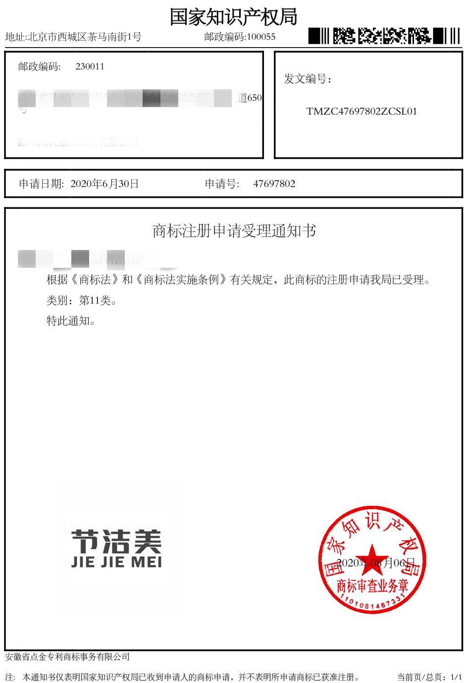 第11类“节洁美”商标受理通知书