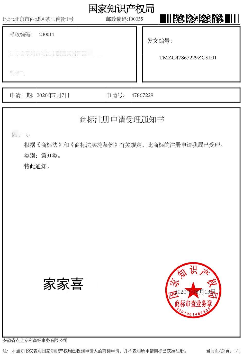 第31类“家家喜”商标受理通知书
