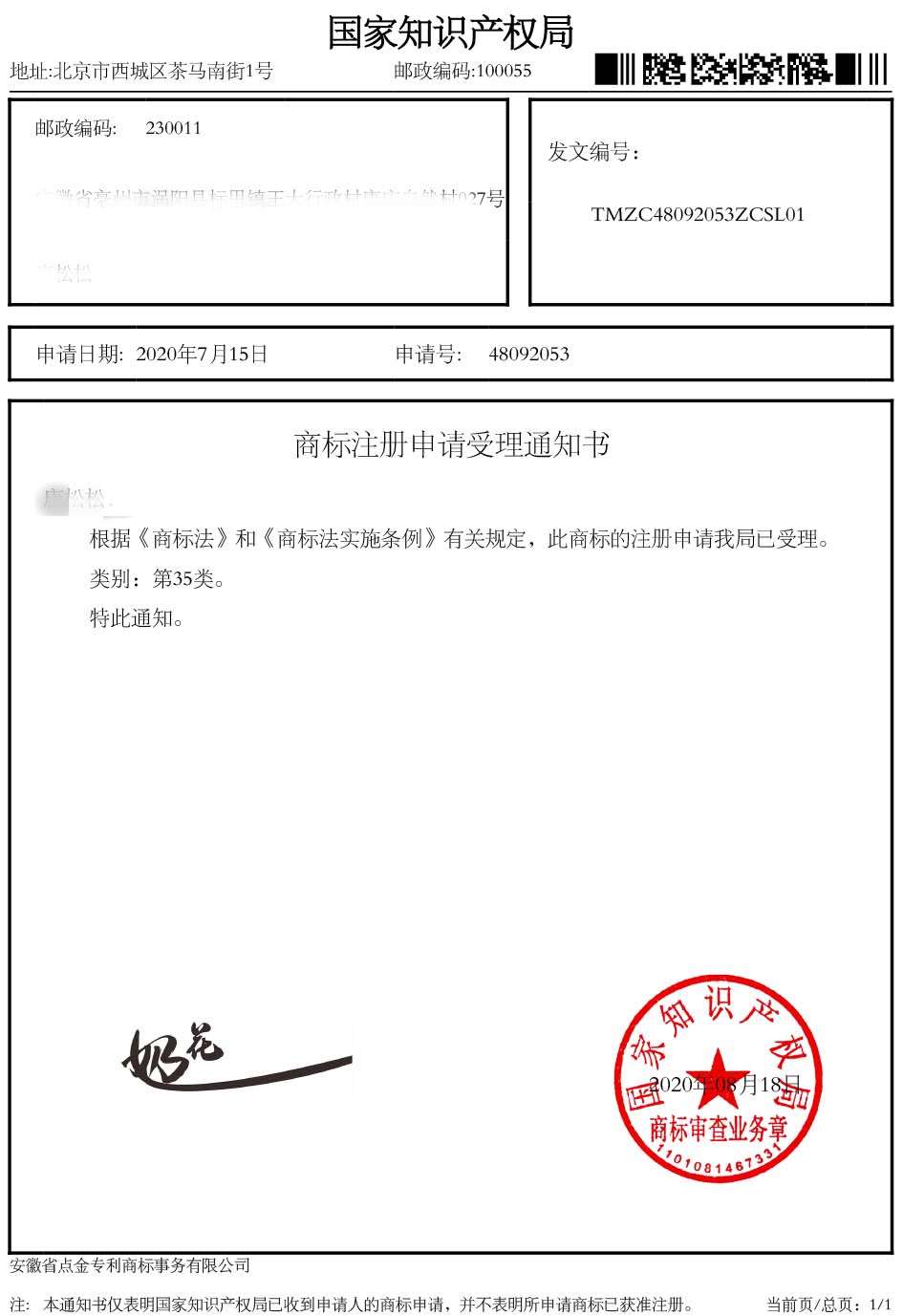 第35类“奶花”商标受理通知书
