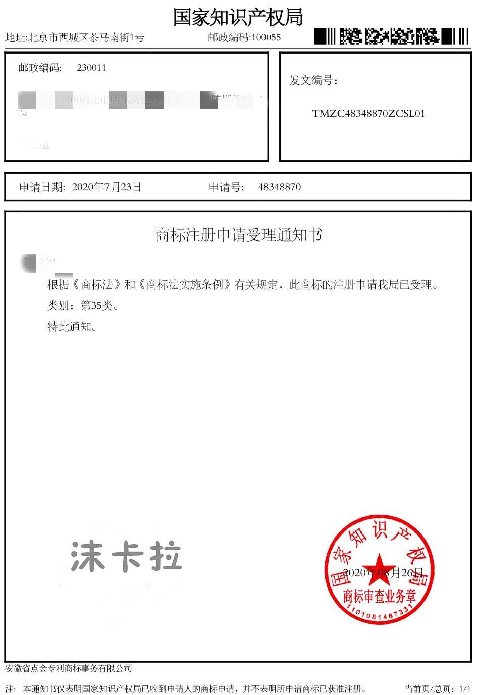 第35类“沫卡拉”商标受理通知书