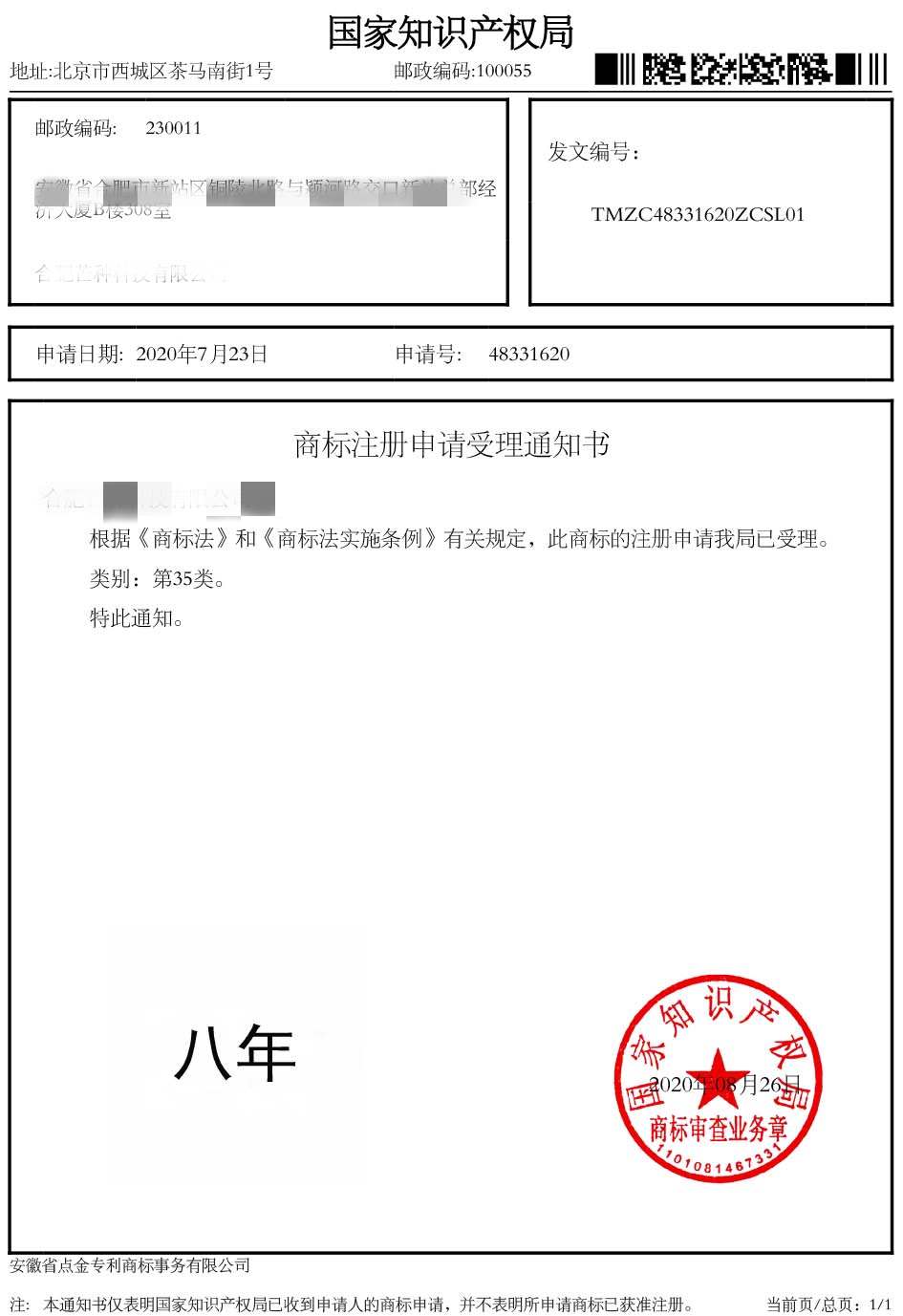 第35类“八年”商标受理通知书