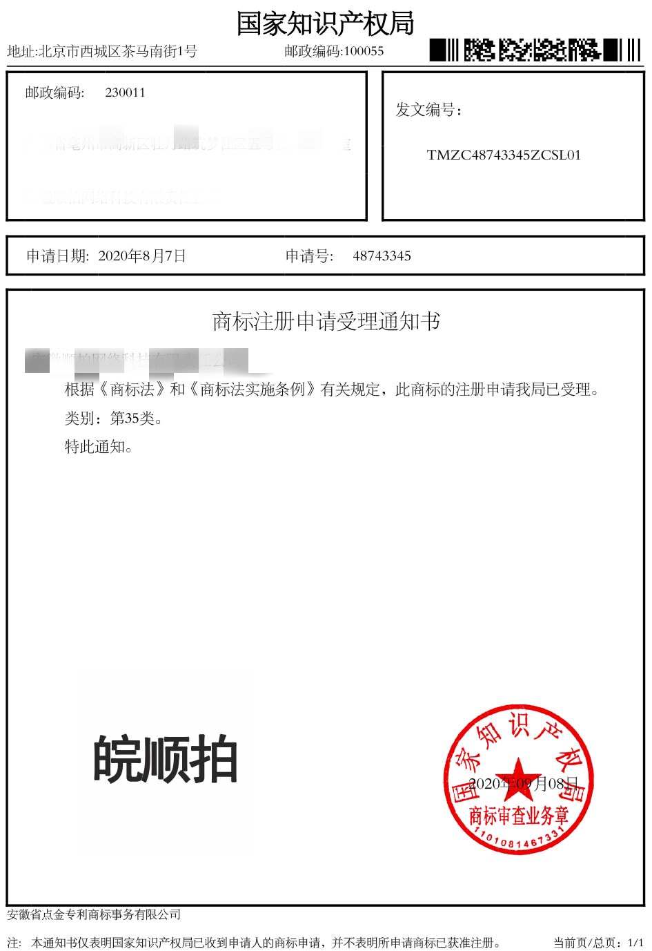 第35类“皖顺拍”商标受理通知书