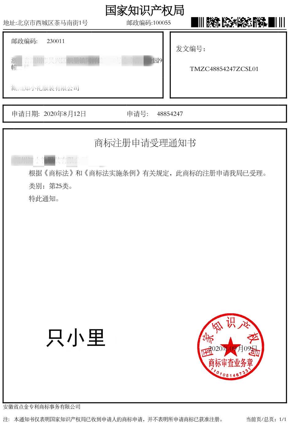 第25类“只小里”商标受理通知书