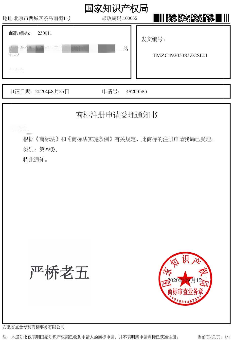 第29类“严桥老五”商标受理通知书