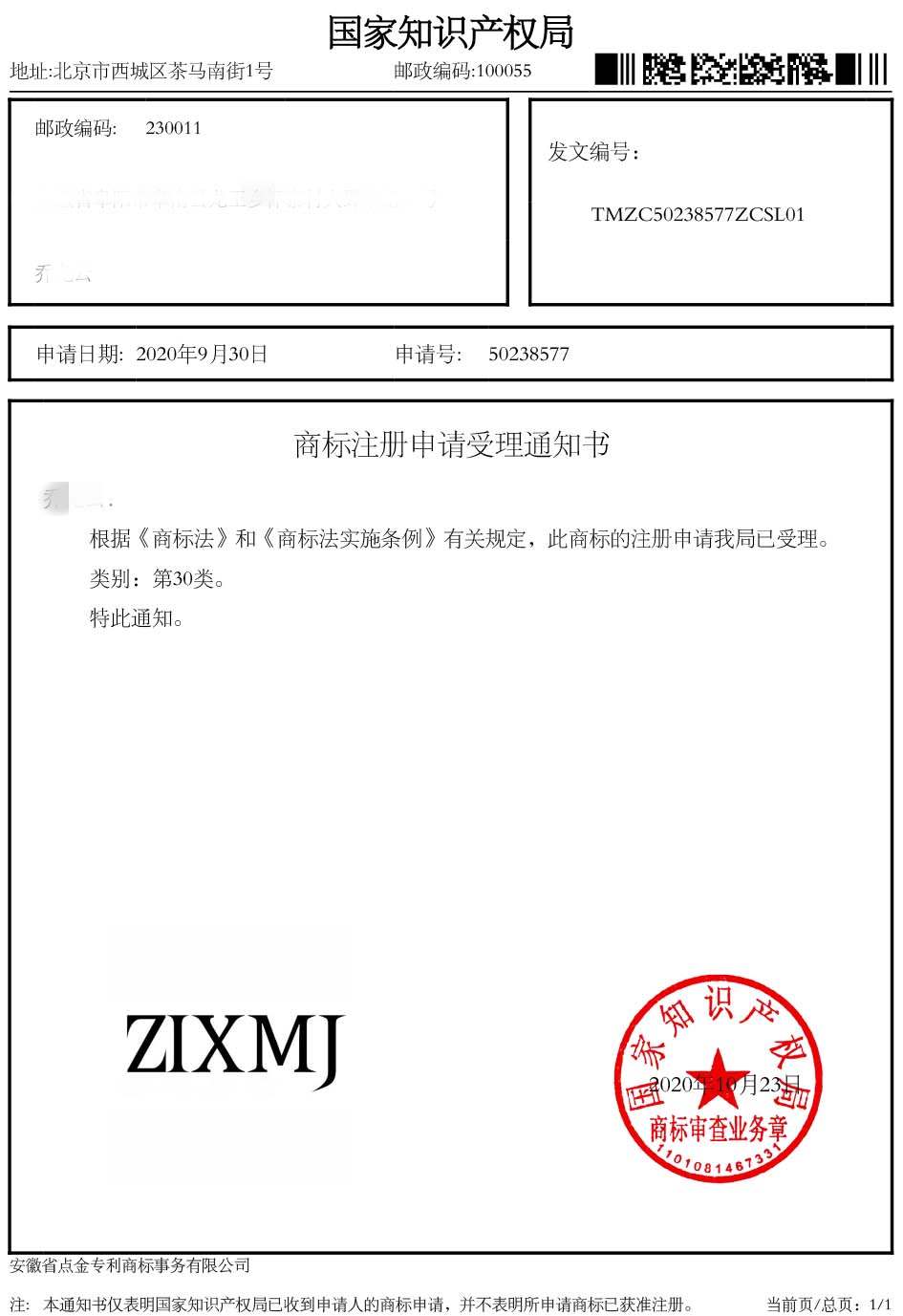 第30类“ZIXMJ”商标受理通知书